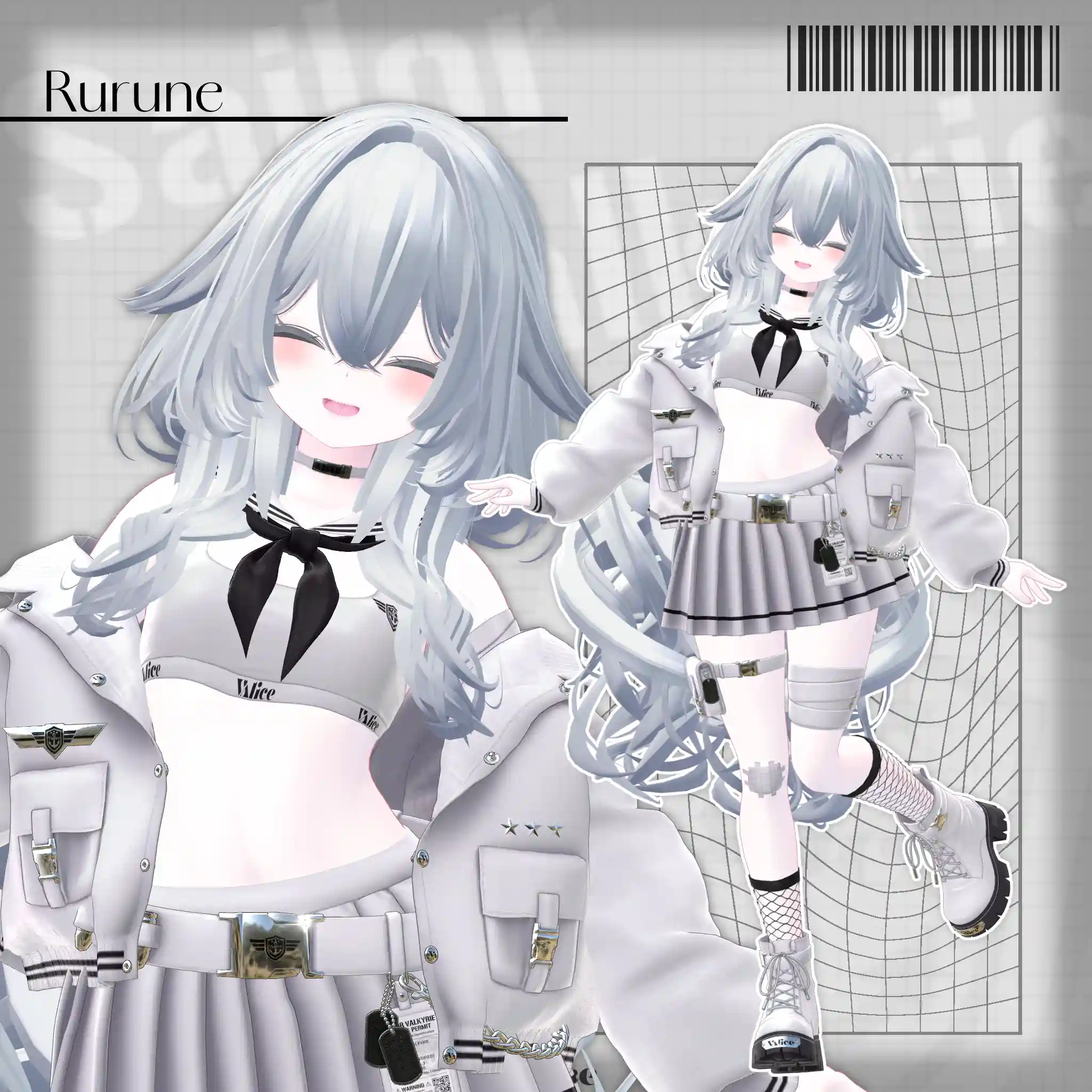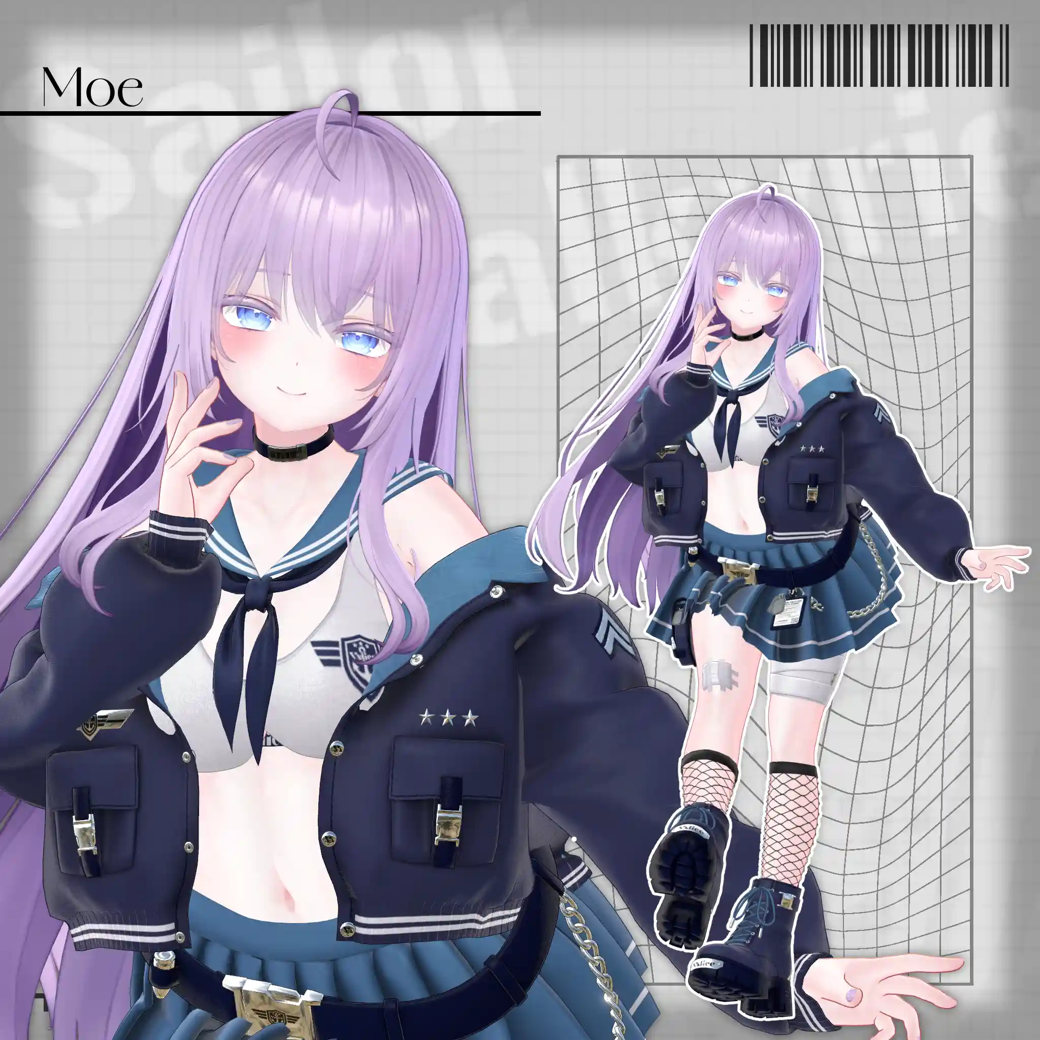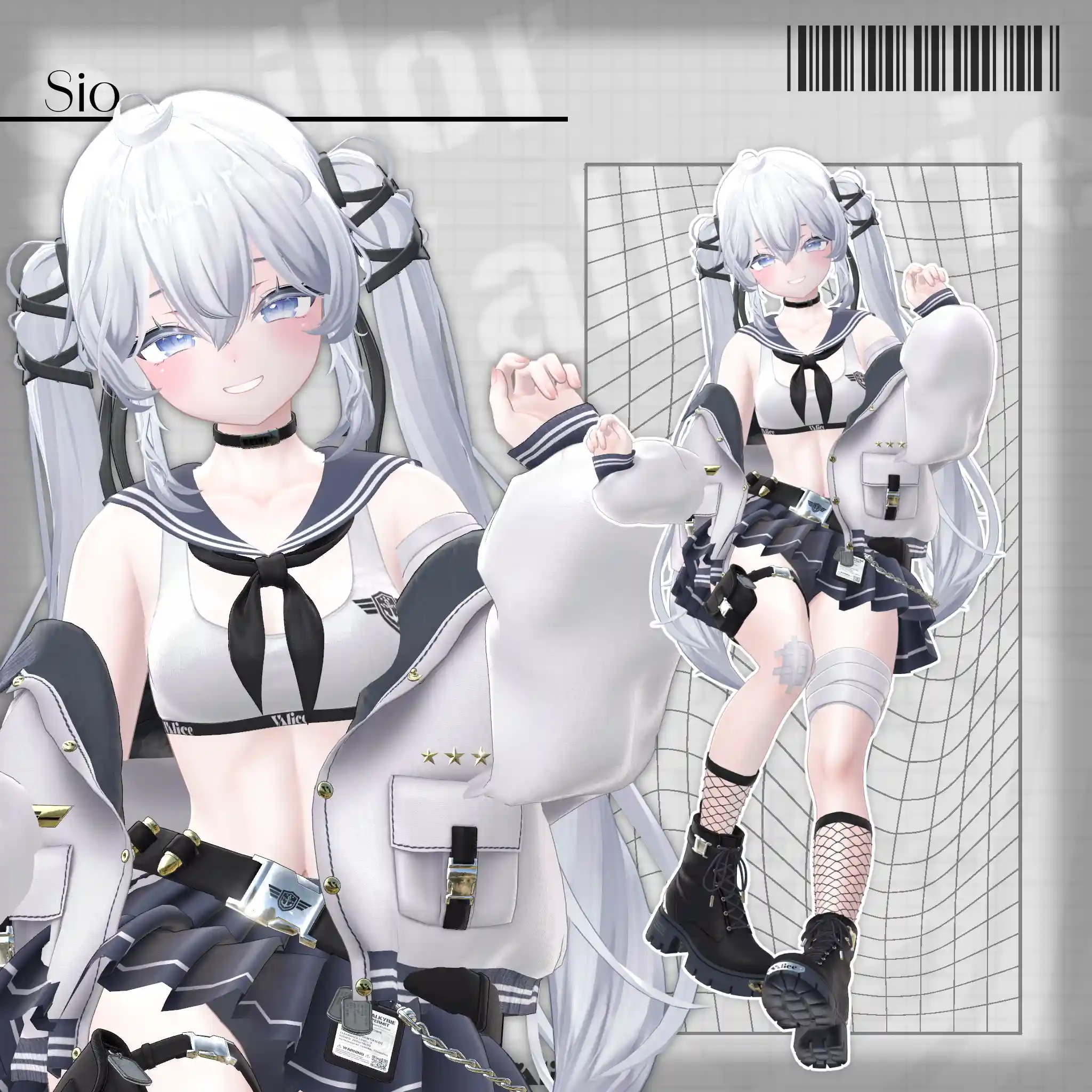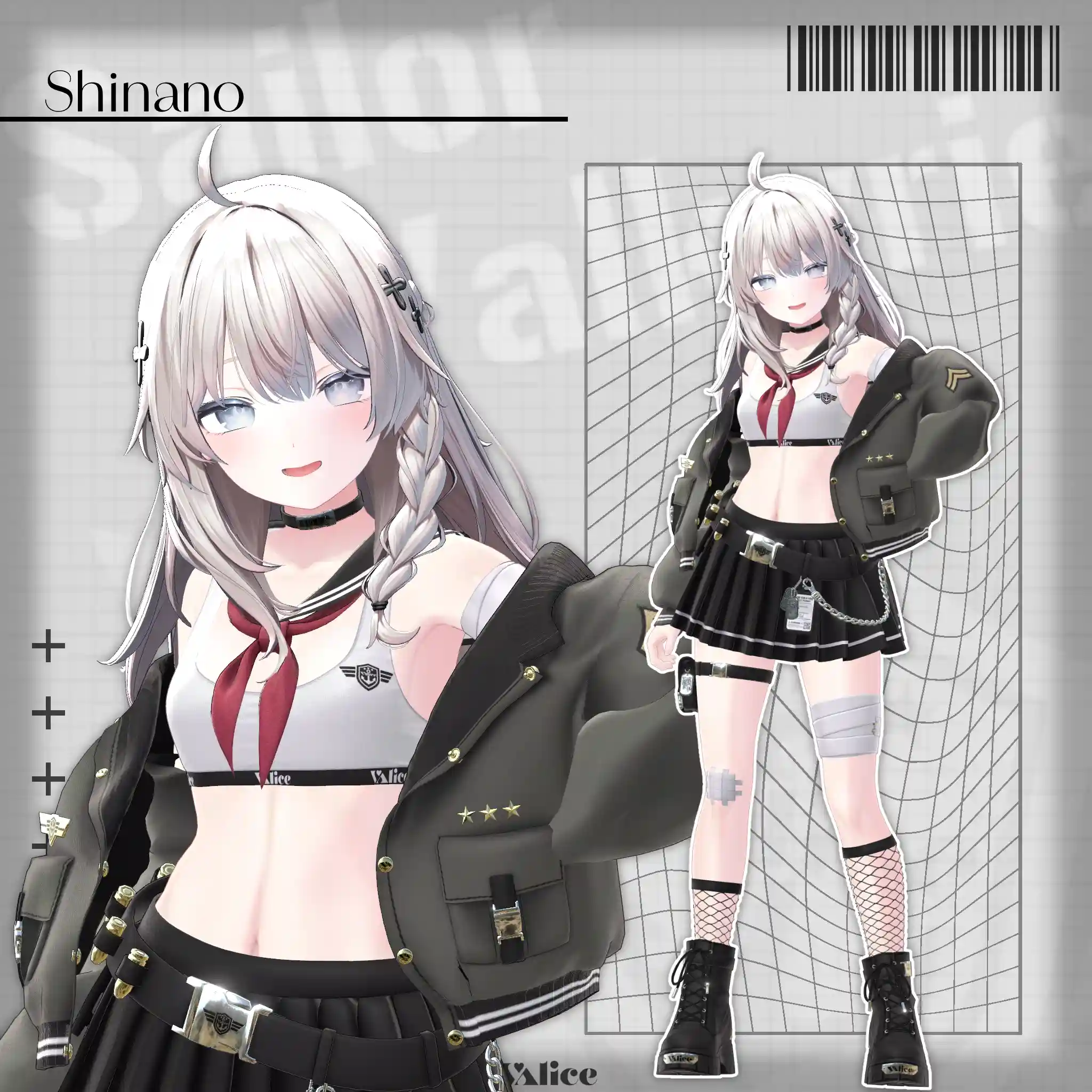 2号店Bonyardにて販売中の「包帯ショート」と合わせてデザインした、VRChat想定のミリタリー×セーラー服モチーフの衣装です。🔗包帯ショートはこちらhttps://stgtokyoavatargatecom.ecbeing.biz/shop/g/gARR-0005/