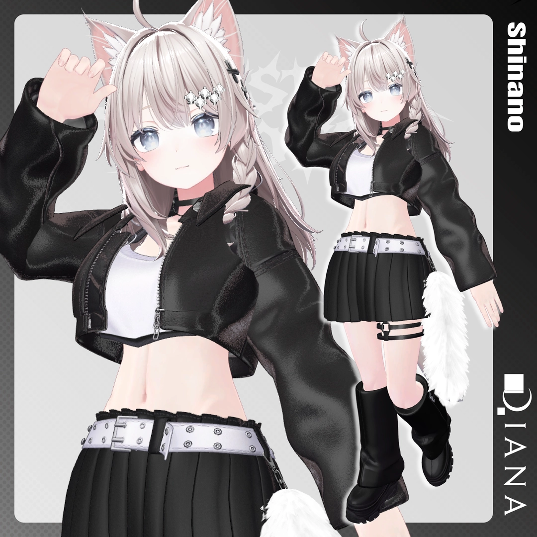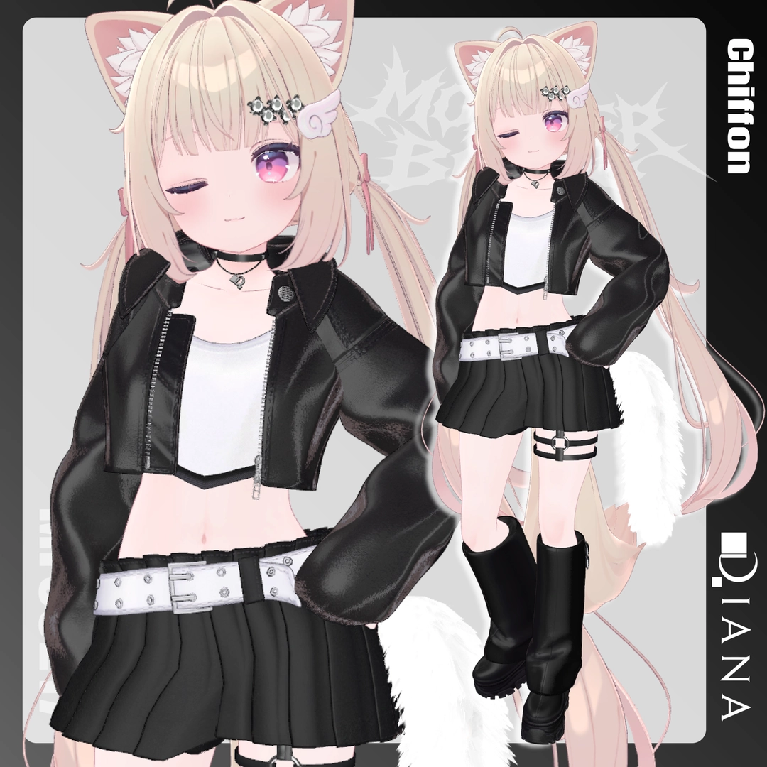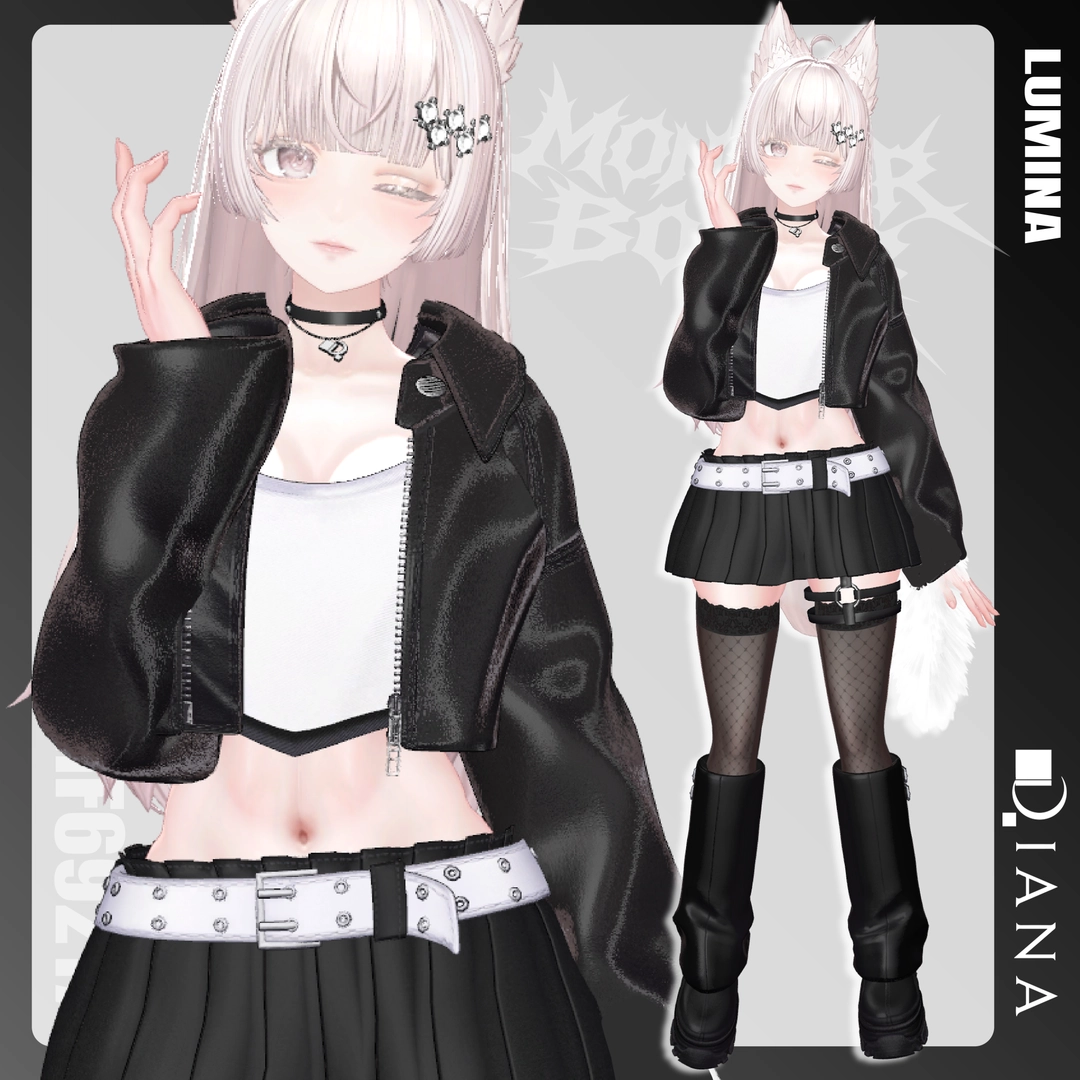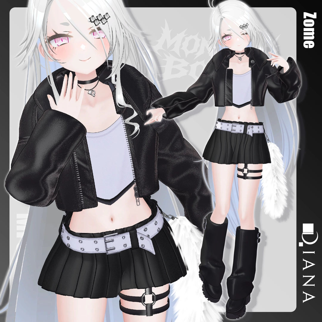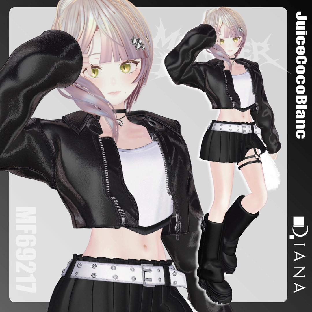 本商品には「ブーツ」「トップス」「ジャケット」「パンツ」「チョーカー」「ヘアアクセサリ」の3Dモデルが含まれます。