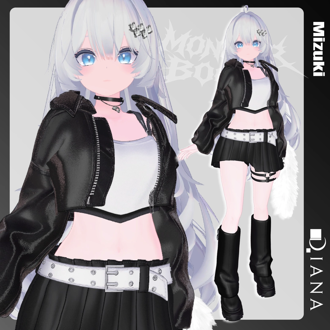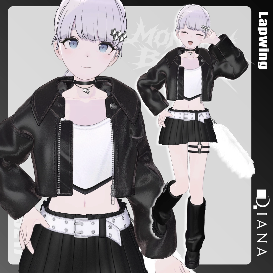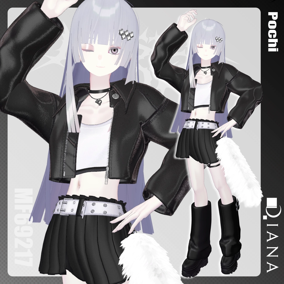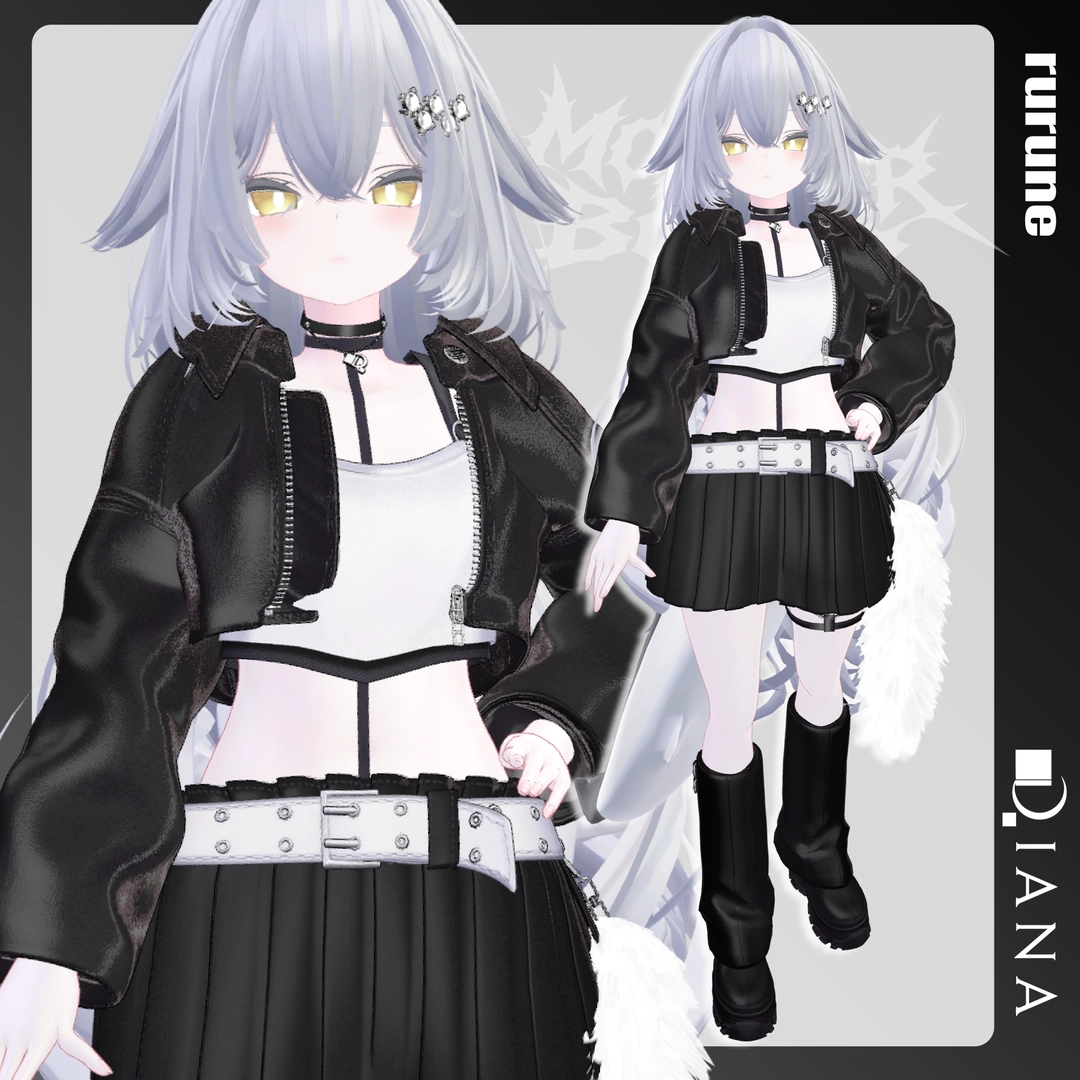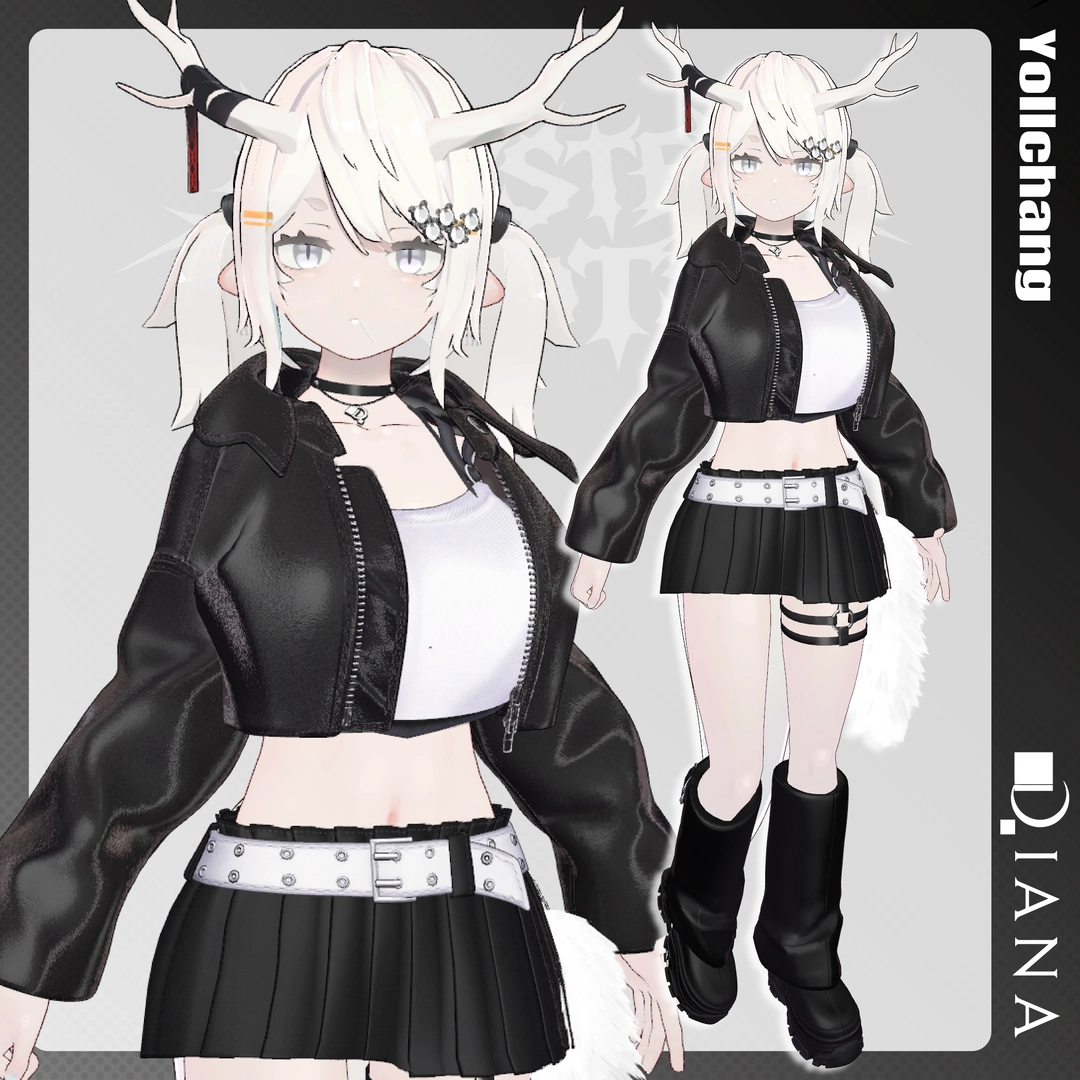 本商品には「ブーツ」「トップス」「ジャケット」「パンツ」「チョーカー」「ヘアアクセサリ」の3Dモデルが含まれます。