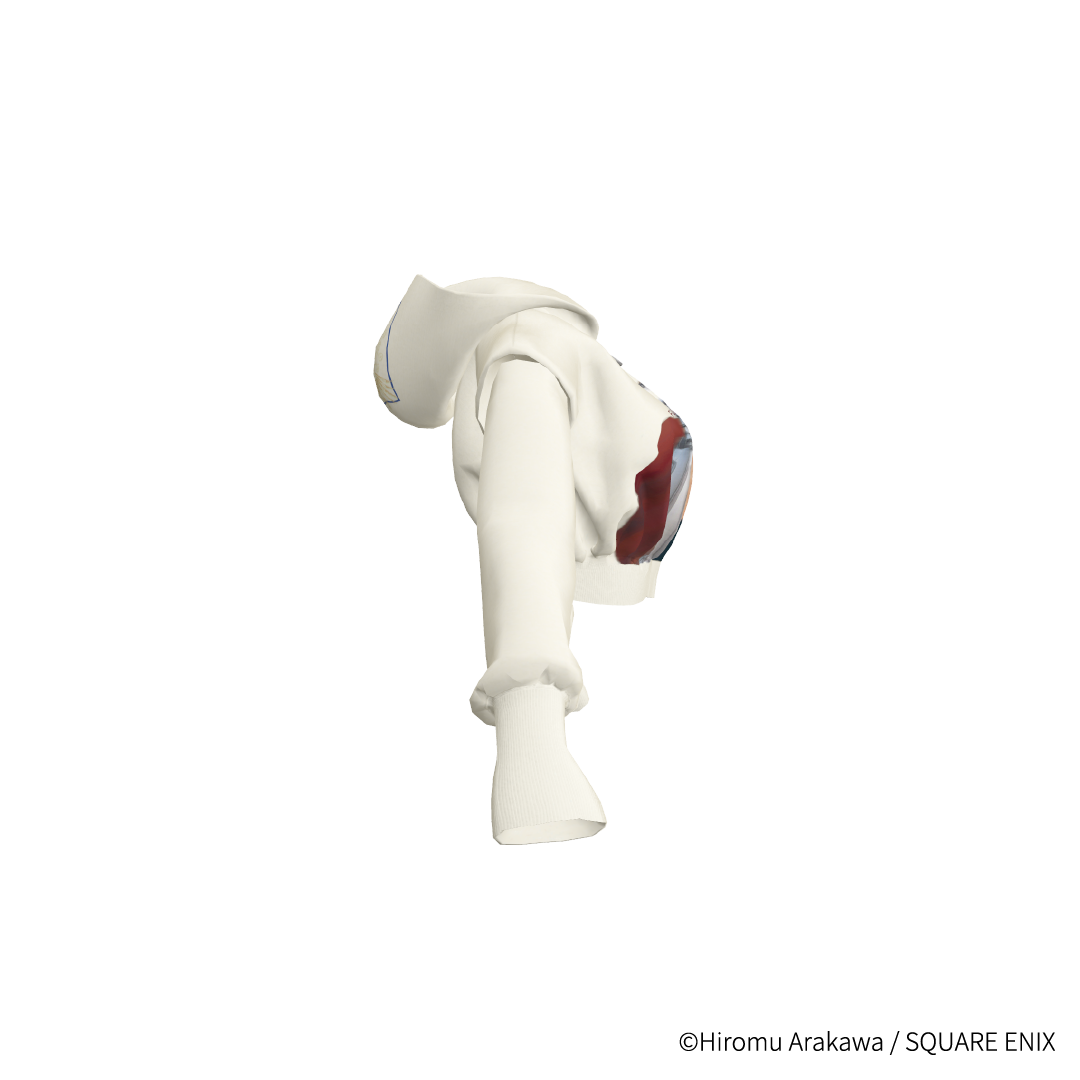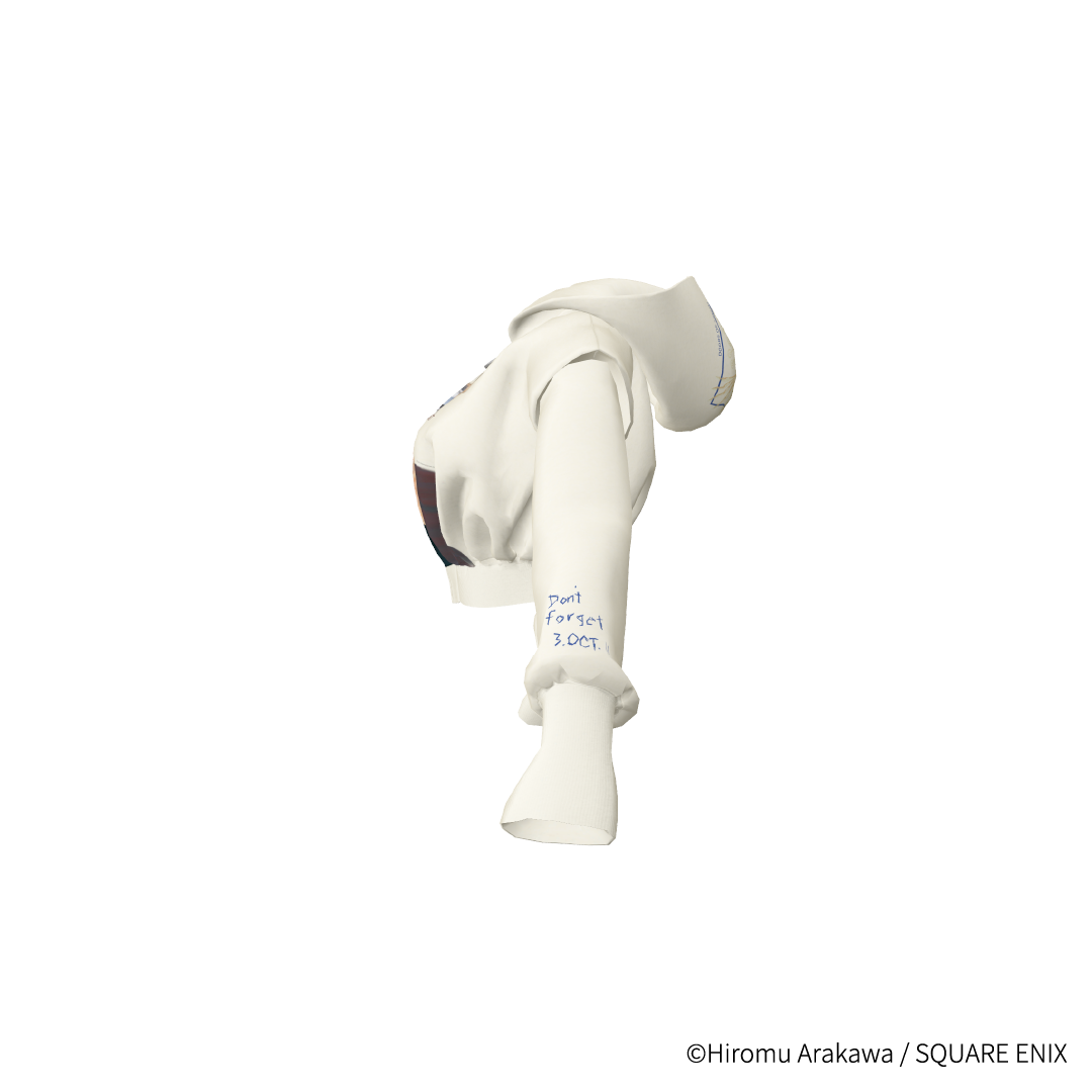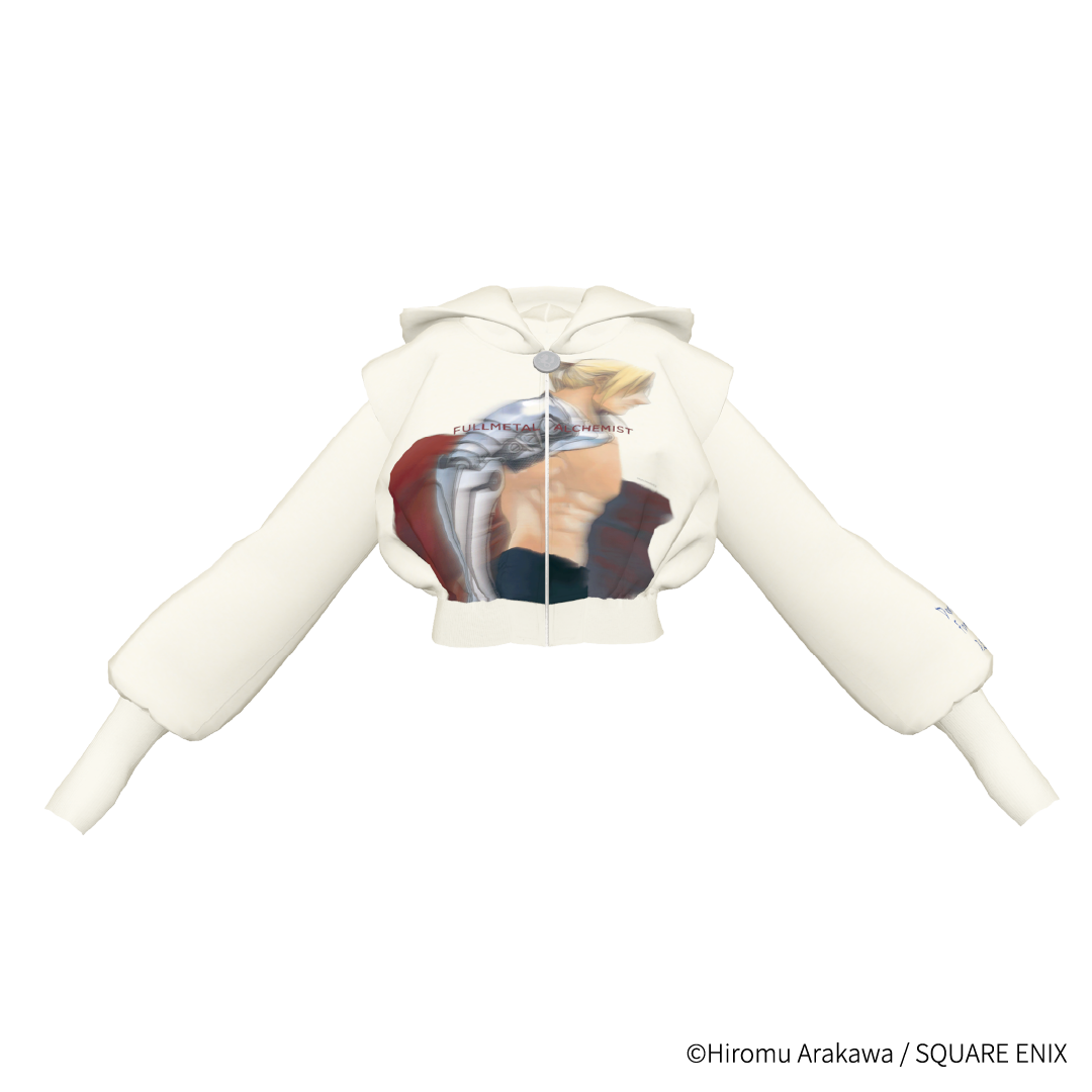 前面にはエドワード・エルリック、フード部分には真理の扉をモチーフとしたデザイン、袖には銀時計に刻まれているメッセージ「Don't forget 3 OCT. 11」をプリントしたジップアップパーカー。 銀時計の蓋のモチーフをジップの取手に配している。