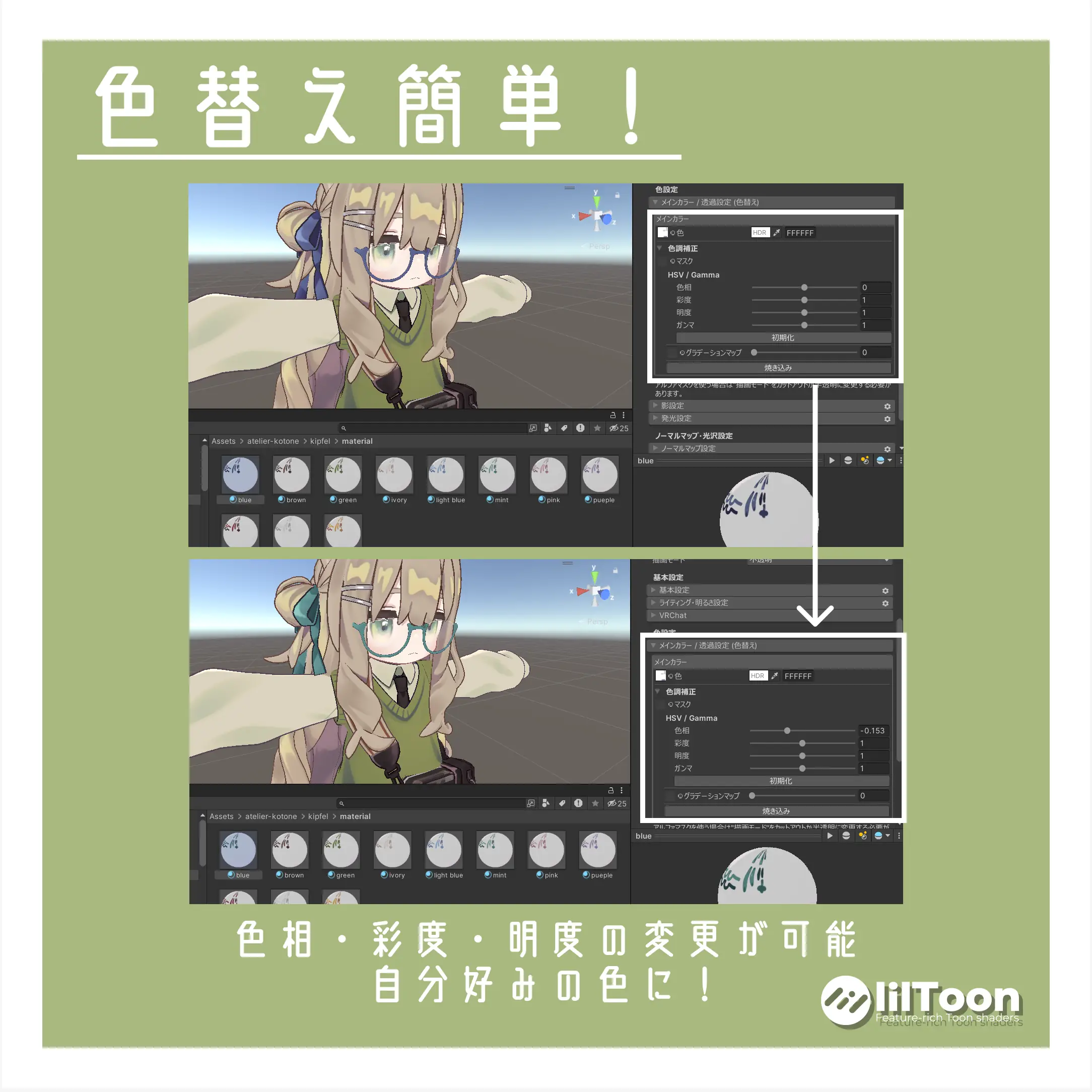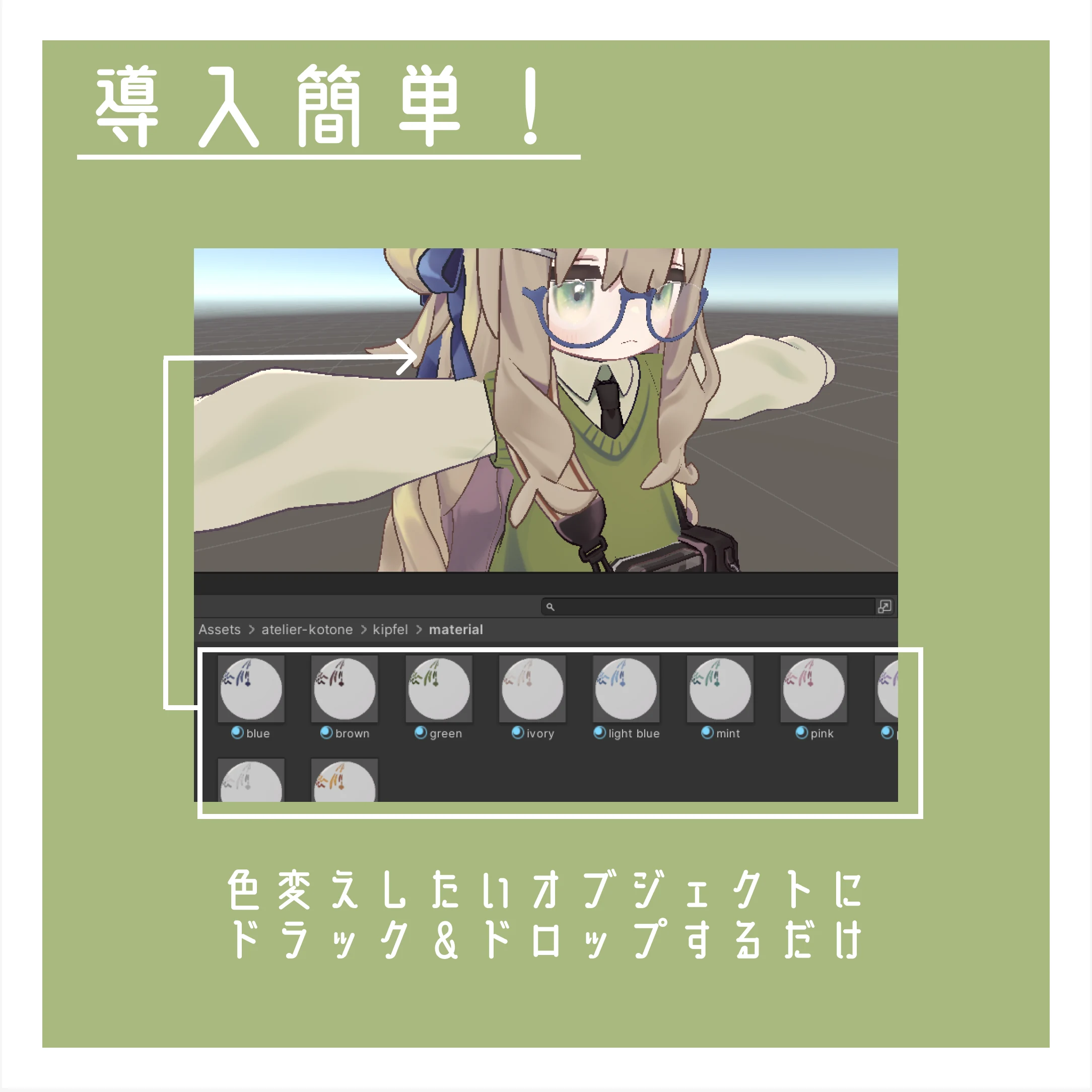 import後、お好きな色のマテリアルをドラック&ドロップするだけで簡単に色を変えることができます。イラストソフト不要です。各10色用意しています。