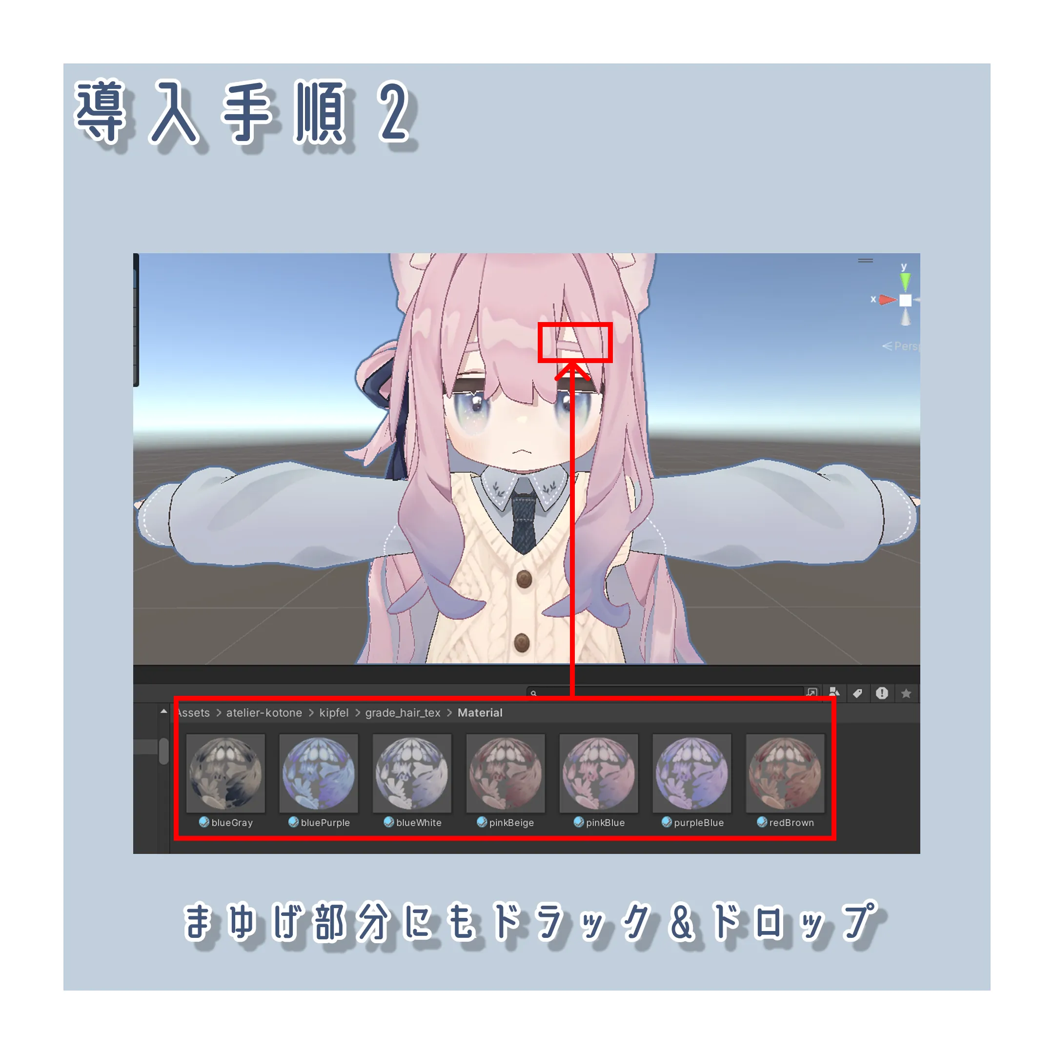 import後、お好きな色のマテリアルをドラック&ドロップするだけで簡単に色を変えることができます。イラストソフト不要です。