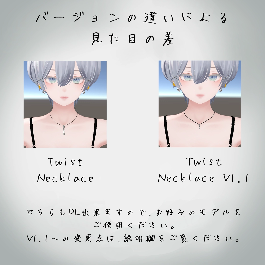 ・Twist_Necklace fbx ・Twist_Necklace unitypackage ・Twist_Necklace UV(V1.1のみ) ・Twist_Necklace TexとMask(V1.1のみ)