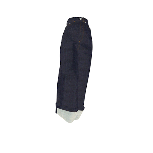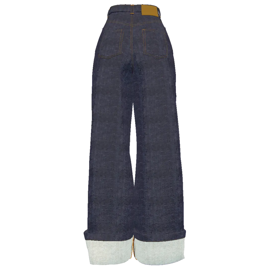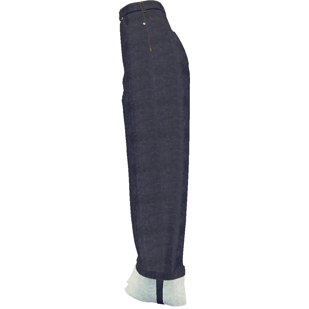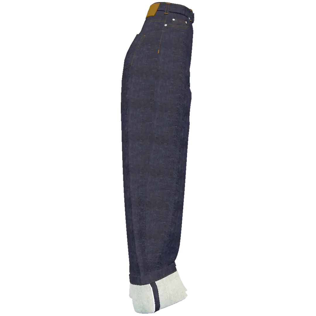 ワイドストレートシルエットのワンウォッシュデニムパンツ。オレンジステッチ・裾の折り返しとセルビッチがアクセント。