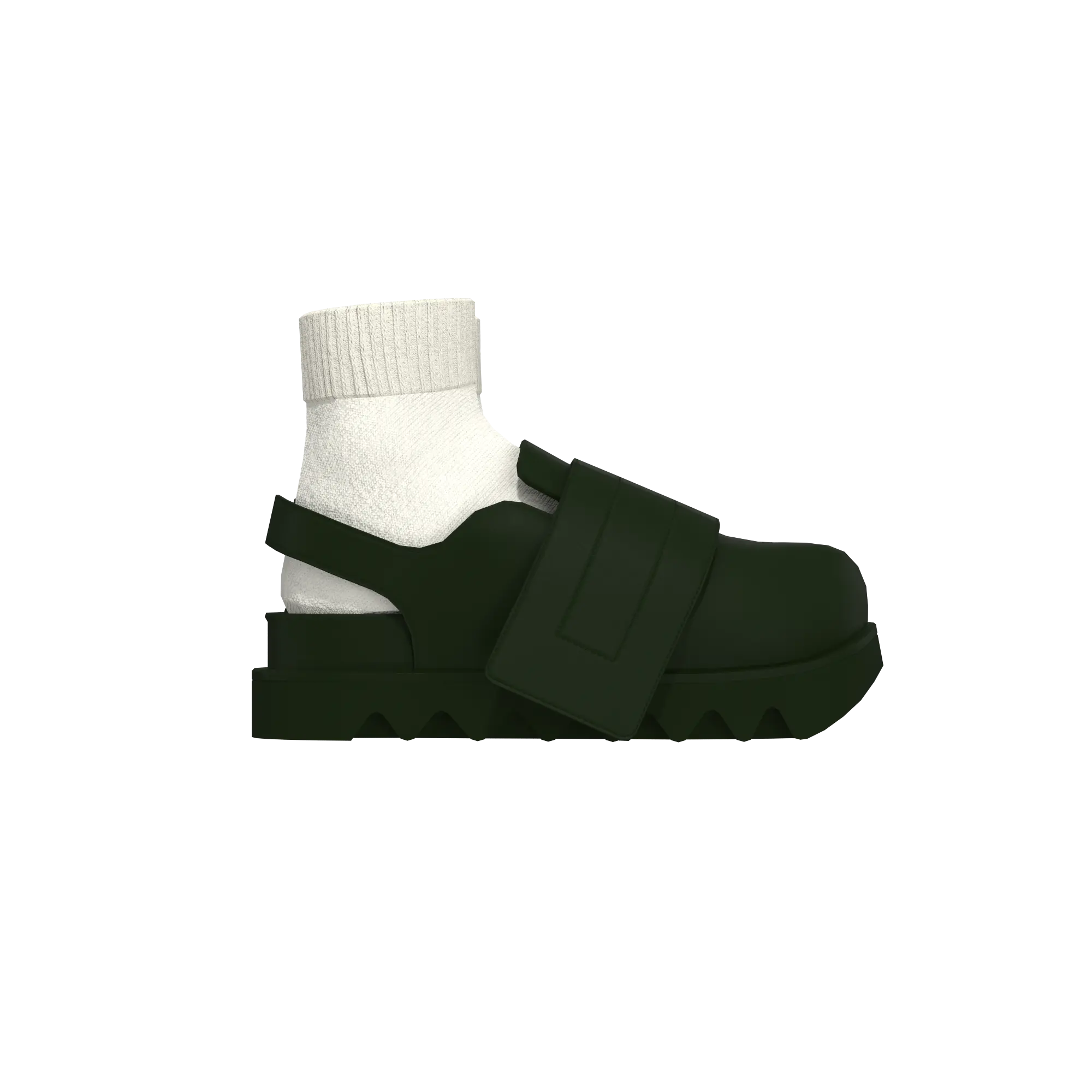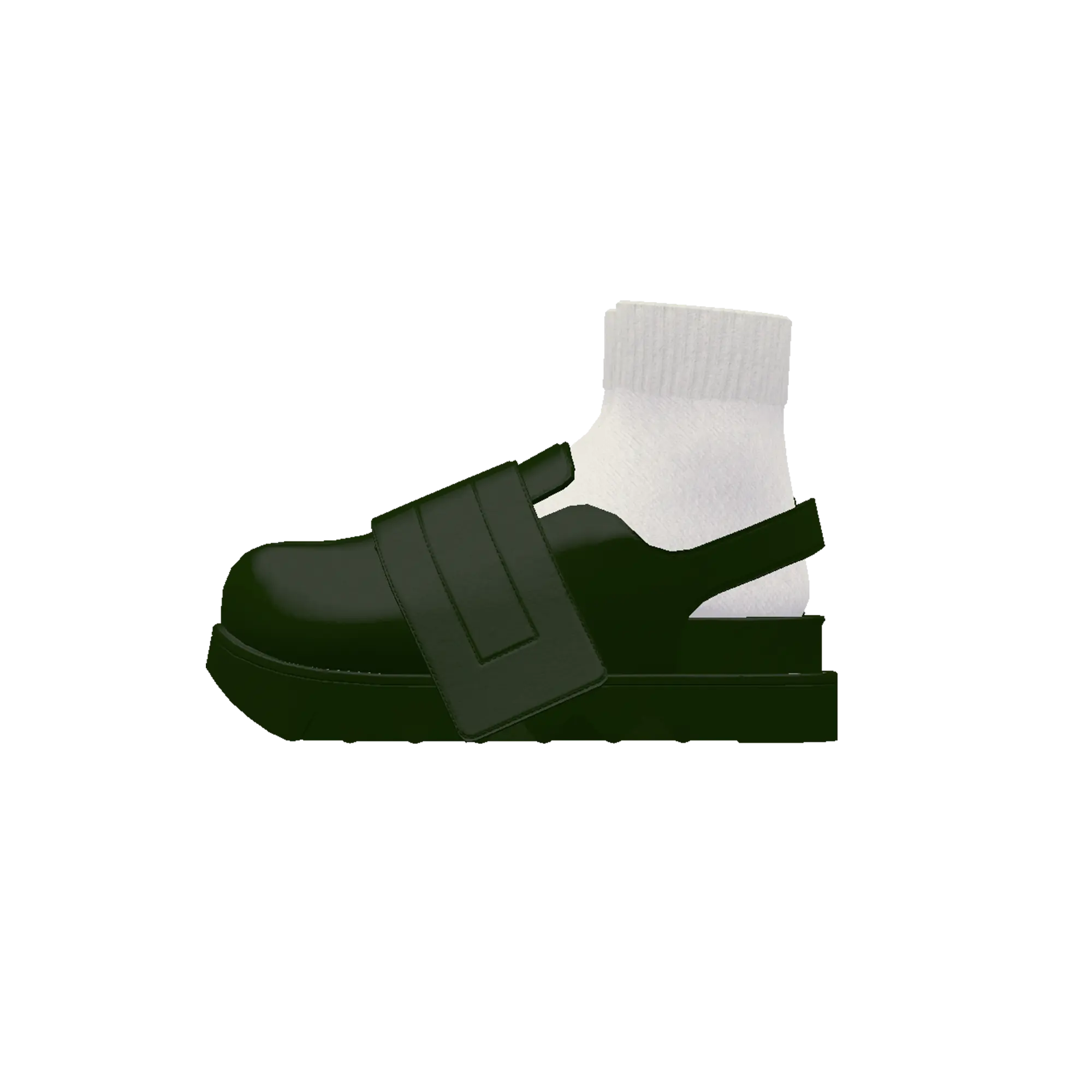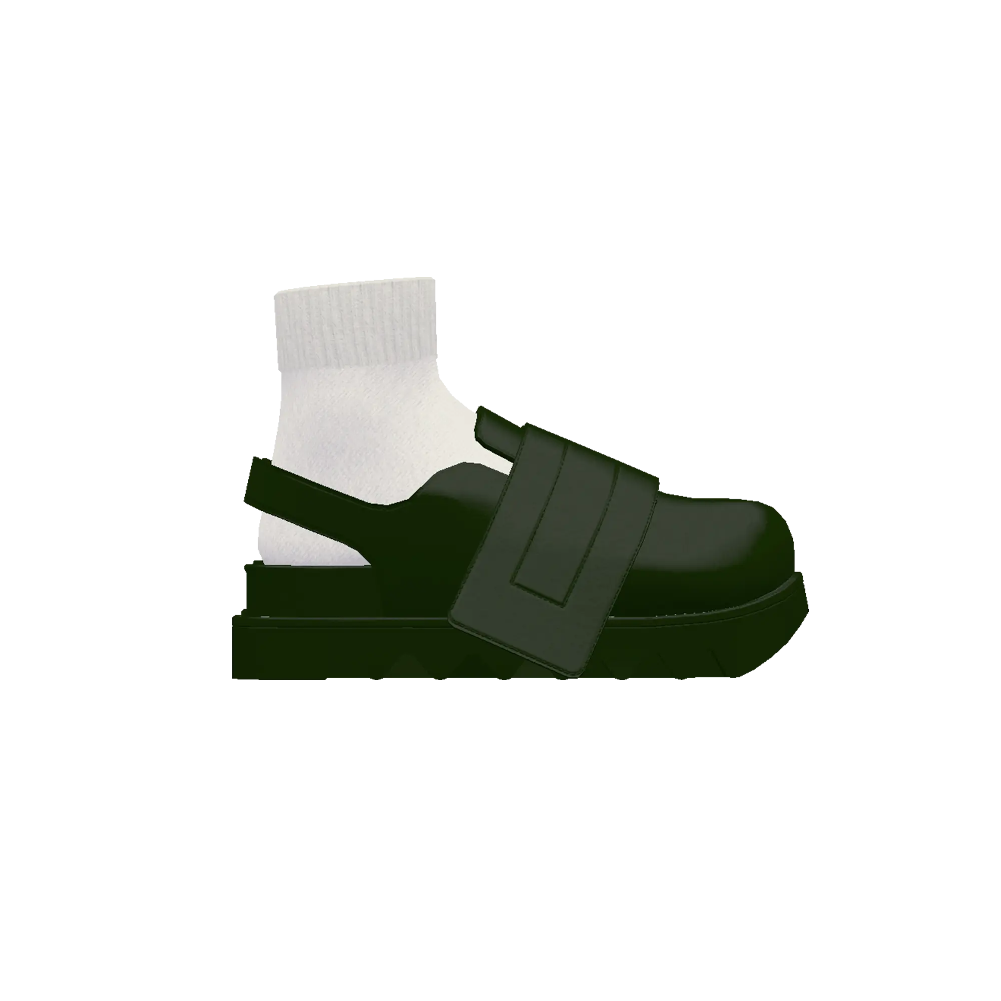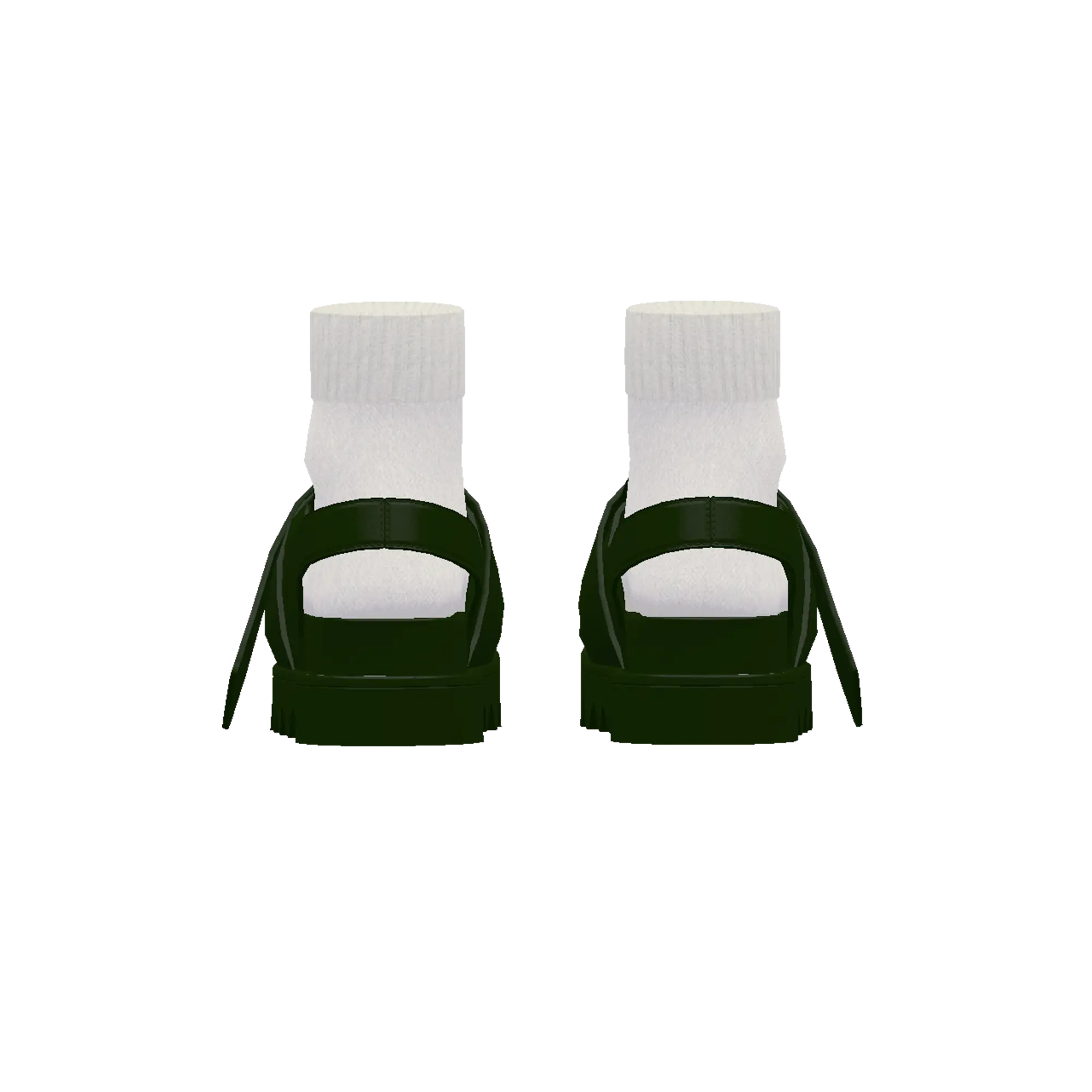 アッパーにレザーを使用し、ショートパンツと同じデザインを採用したベルテッドサンダル。くるぶし丈のショートソックス付き。