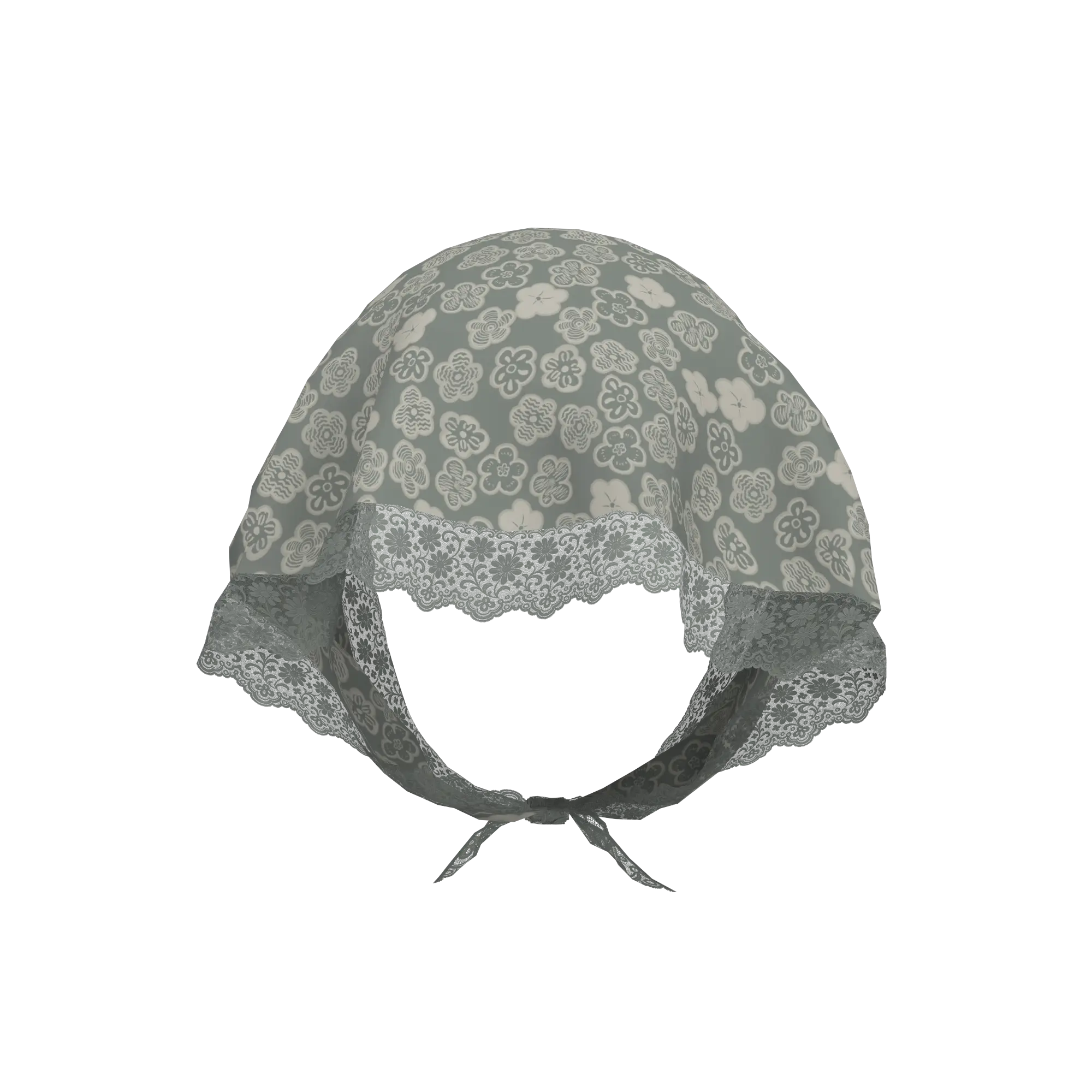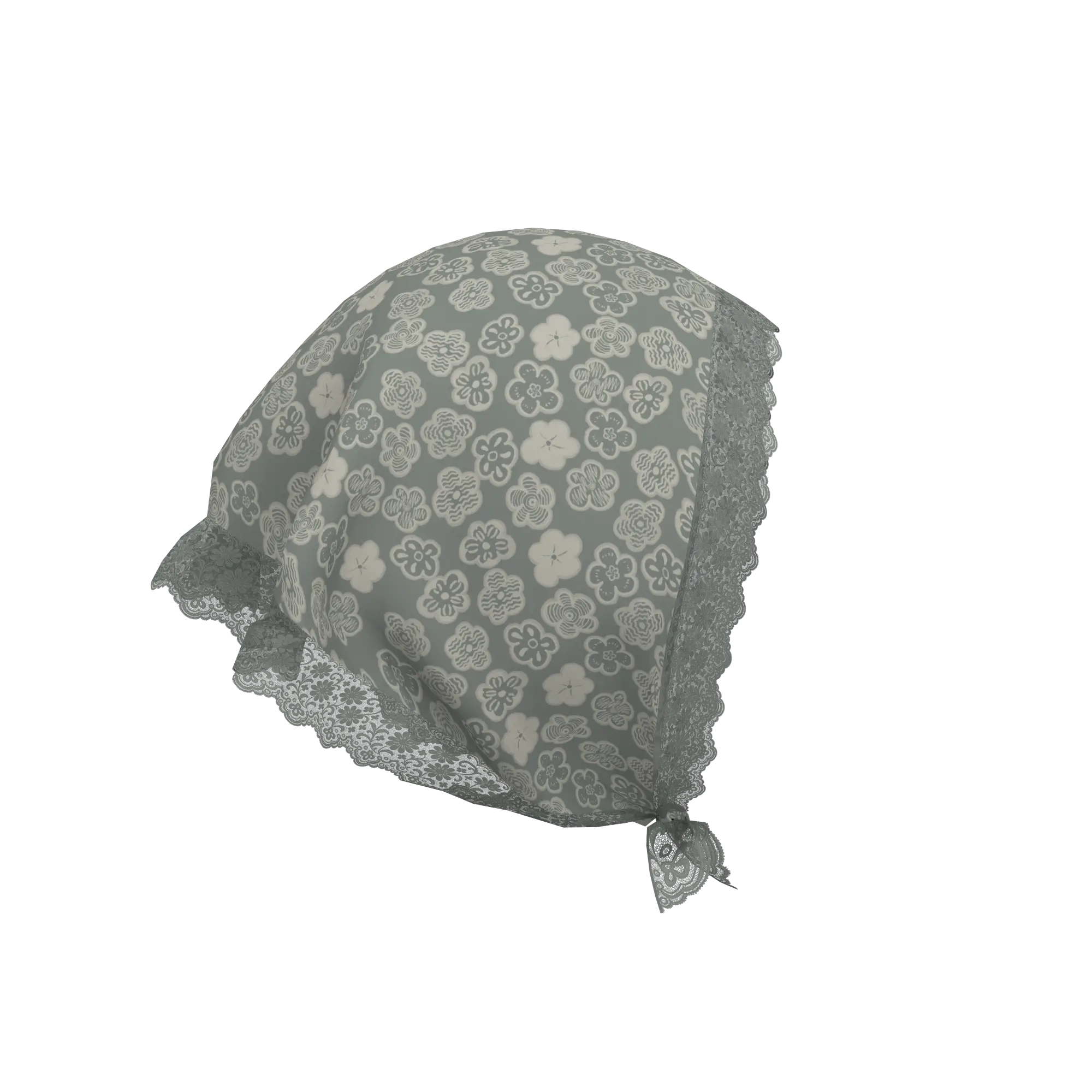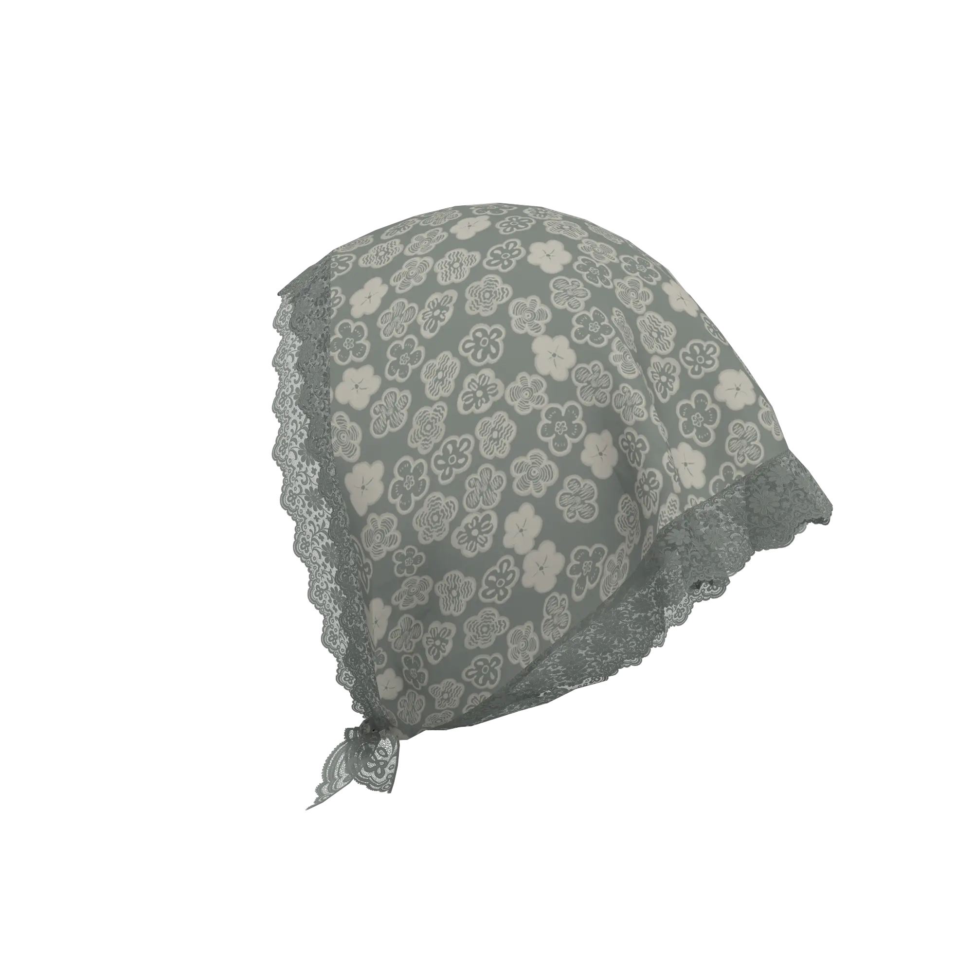 縁にレースを施したシルク素材のフラワープリントスカーフ。今シーズントレンドである頭に巻き付けたスタイリングがおすすめ。グレートーンのショートヘアー付き。