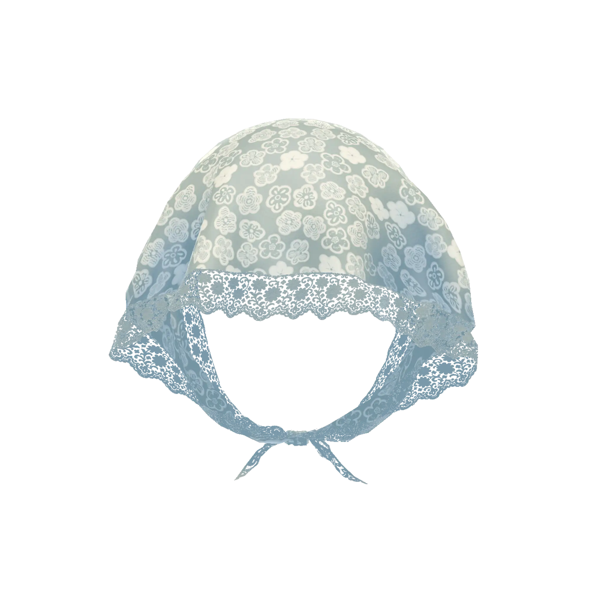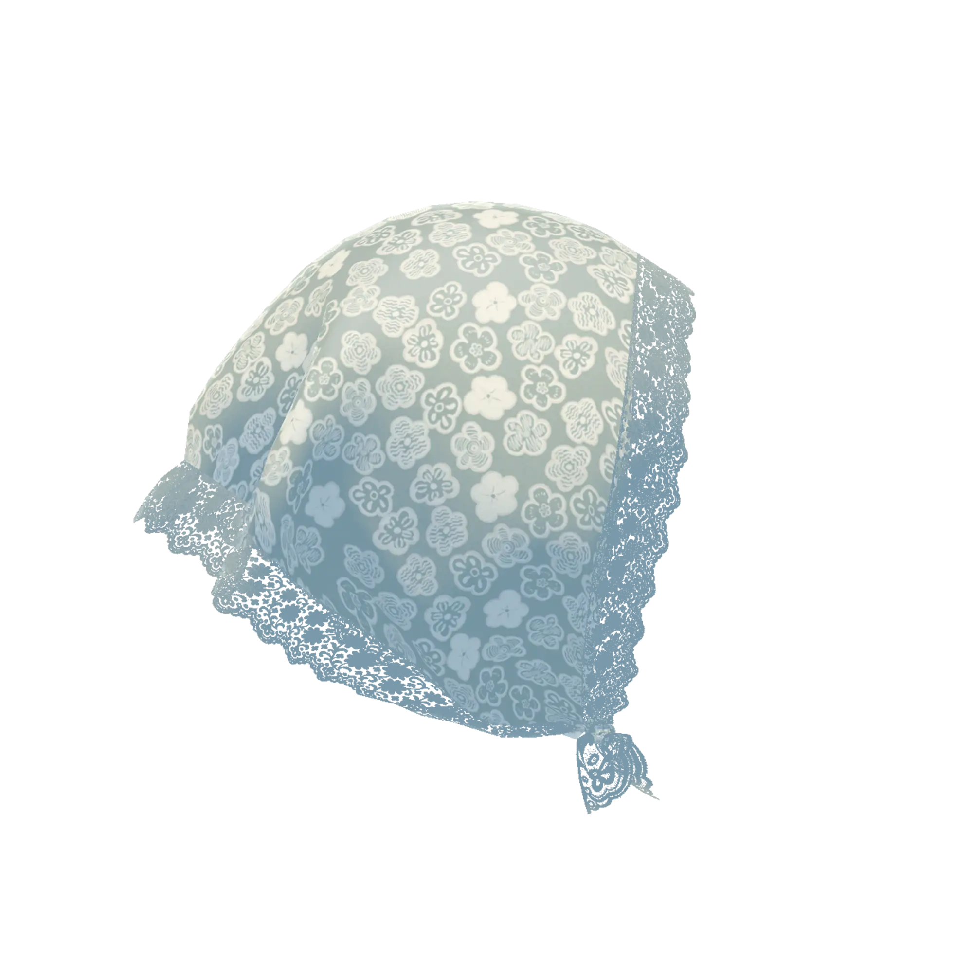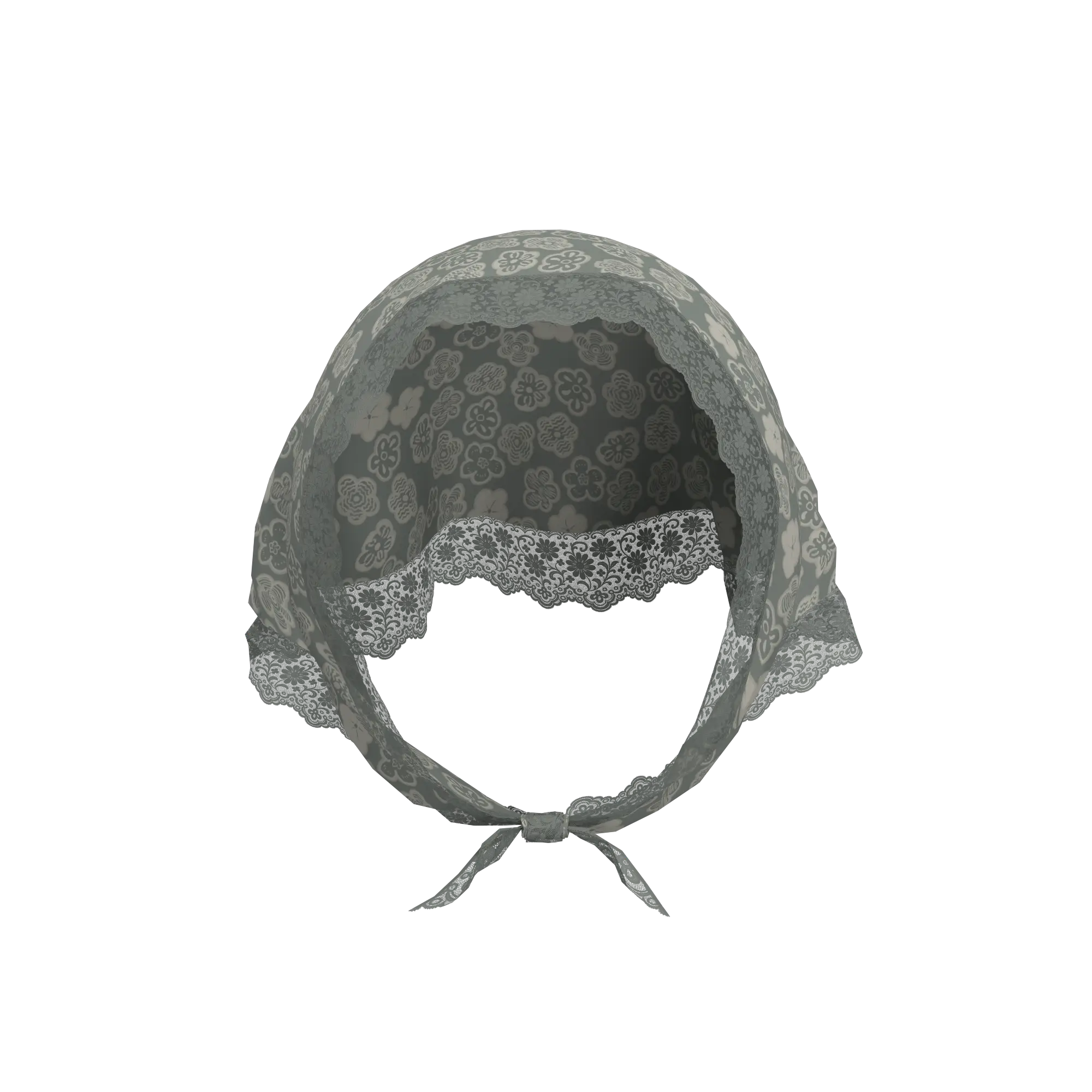 縁にレースを施したシルク素材のフラワープリントスカーフ。今シーズントレンドである頭に巻き付けたスタイリングがおすすめ。グレートーンのショートヘアー付き。