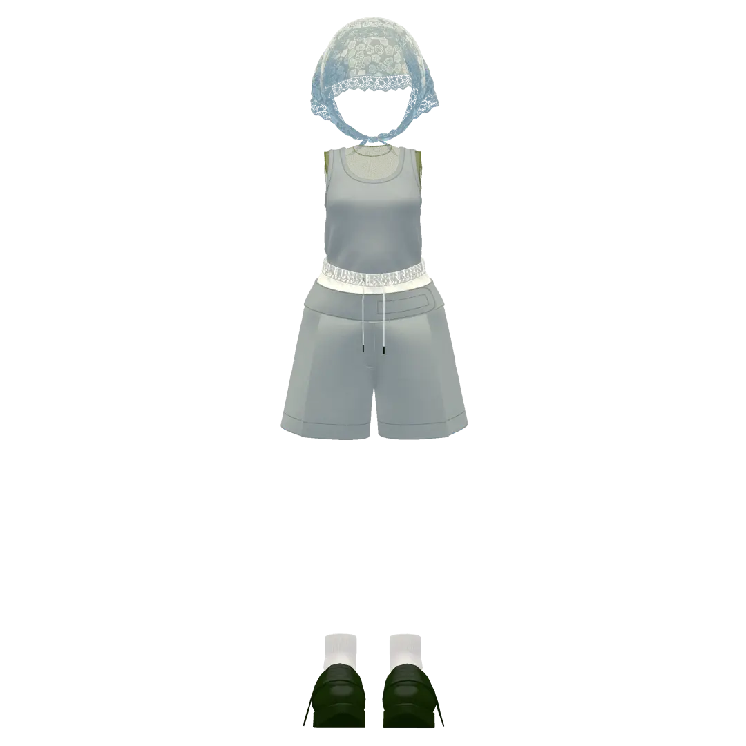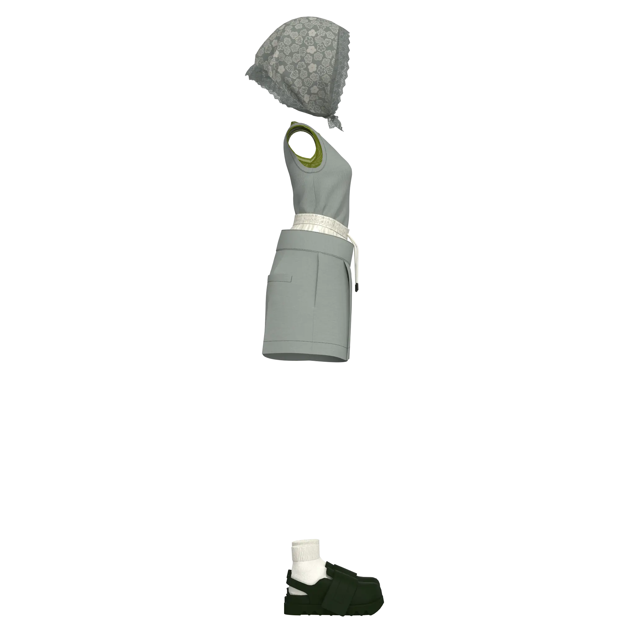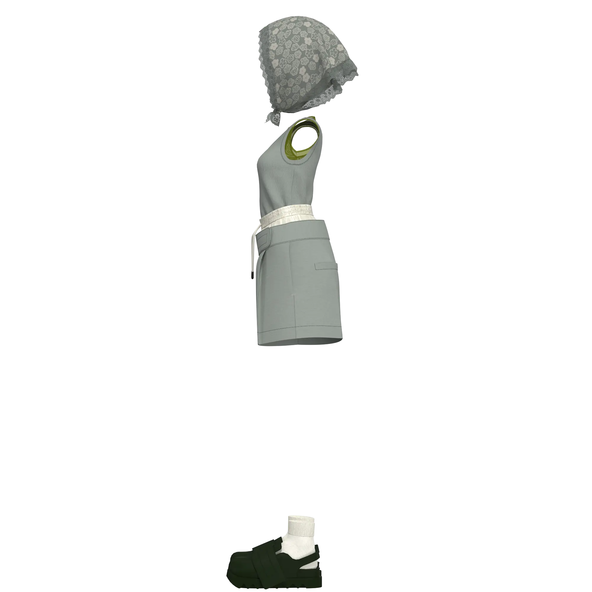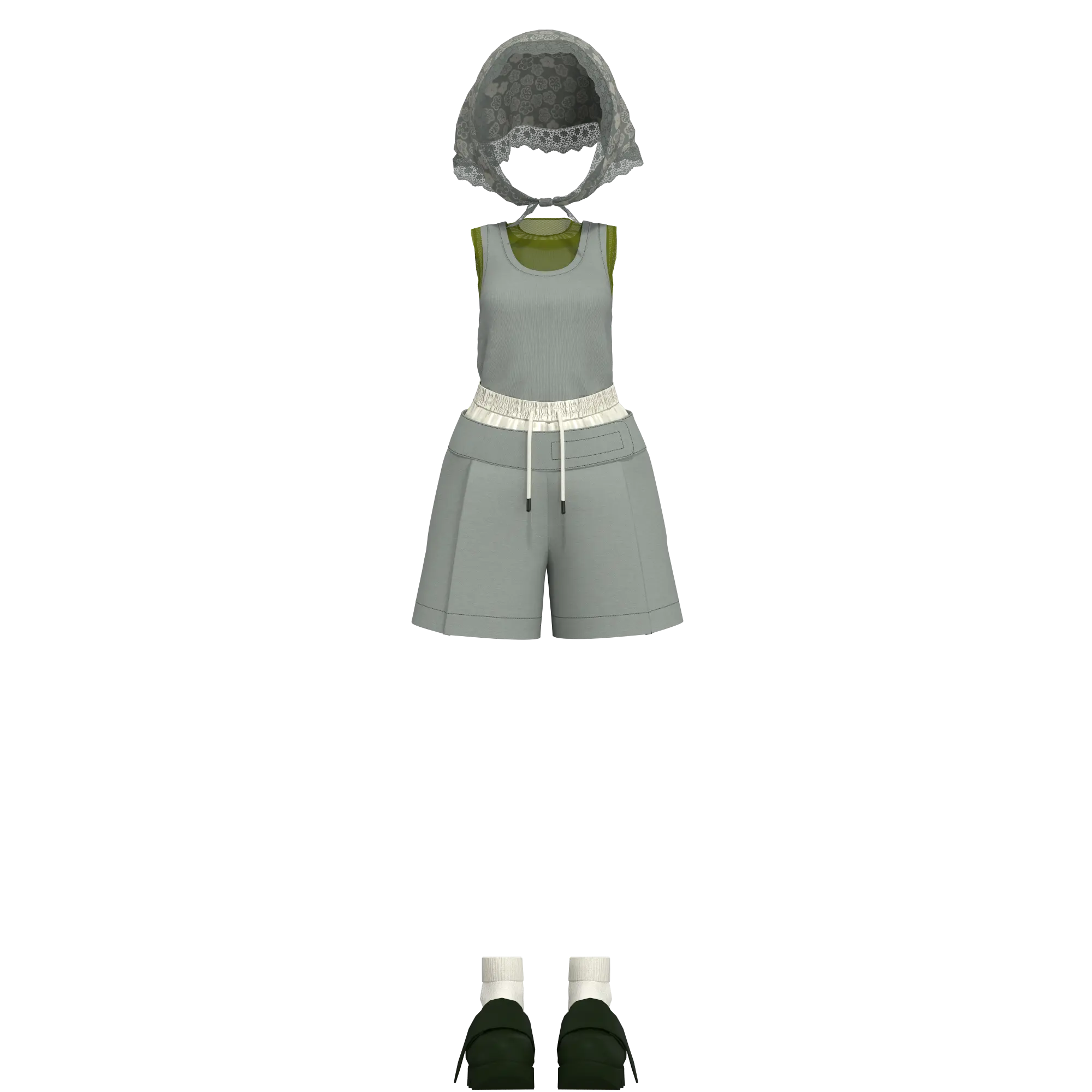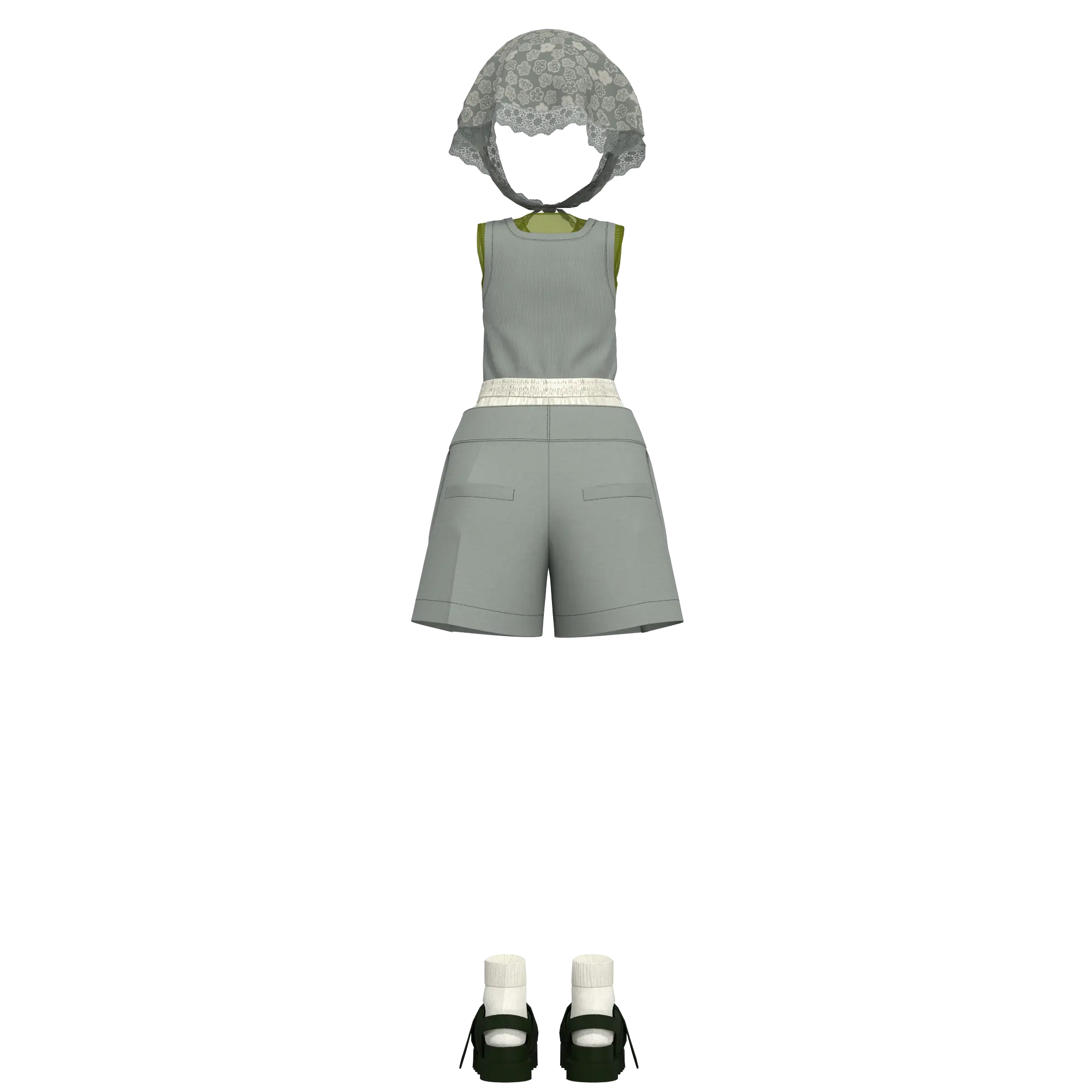 BELTED SHORT PANTS (with Tank-top) 重ね着したようなハイブリッド仕様のショートパンツ。共生地のベルトがアクセント。また着脱可能なタンクトップも付属したセットアップアイテム。 カラー:スモーキーグリーン