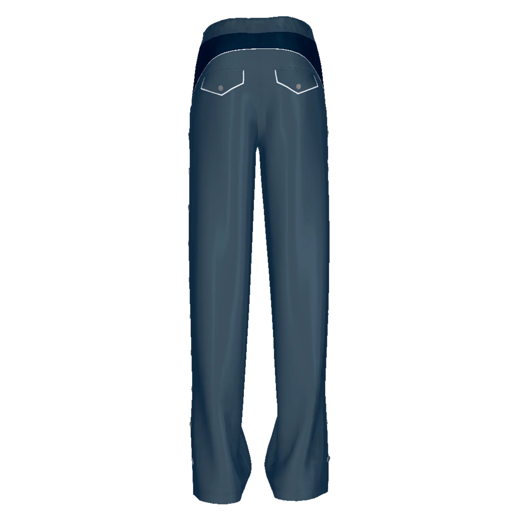 バスケットジャージーのディテールを採用し、ブルーとネイビーのバイカラーに白のパイピングが効いたトラックパンツ。