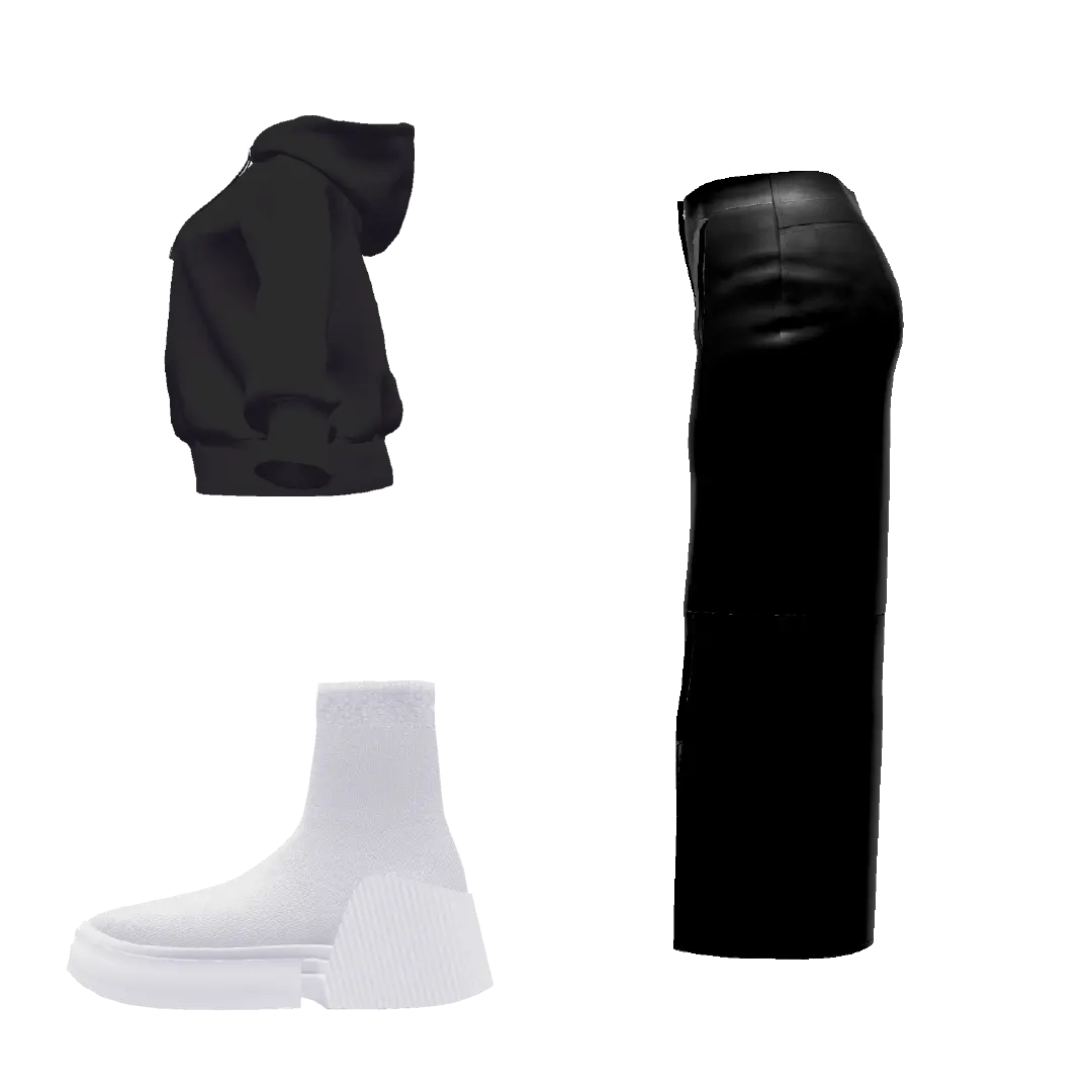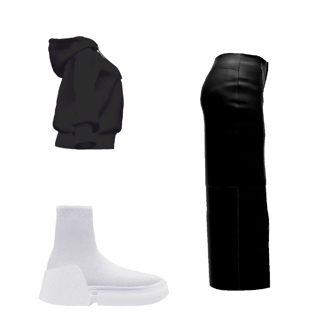 オールブラックのベーシックパーカーとレザースカートにアクセントでホワイトのソックスブーツを差し込んだソリッドスタイル。