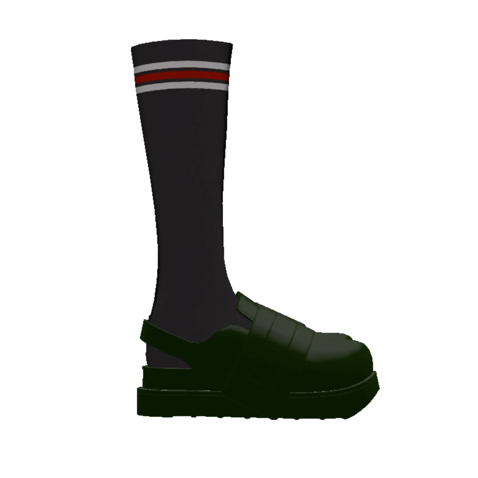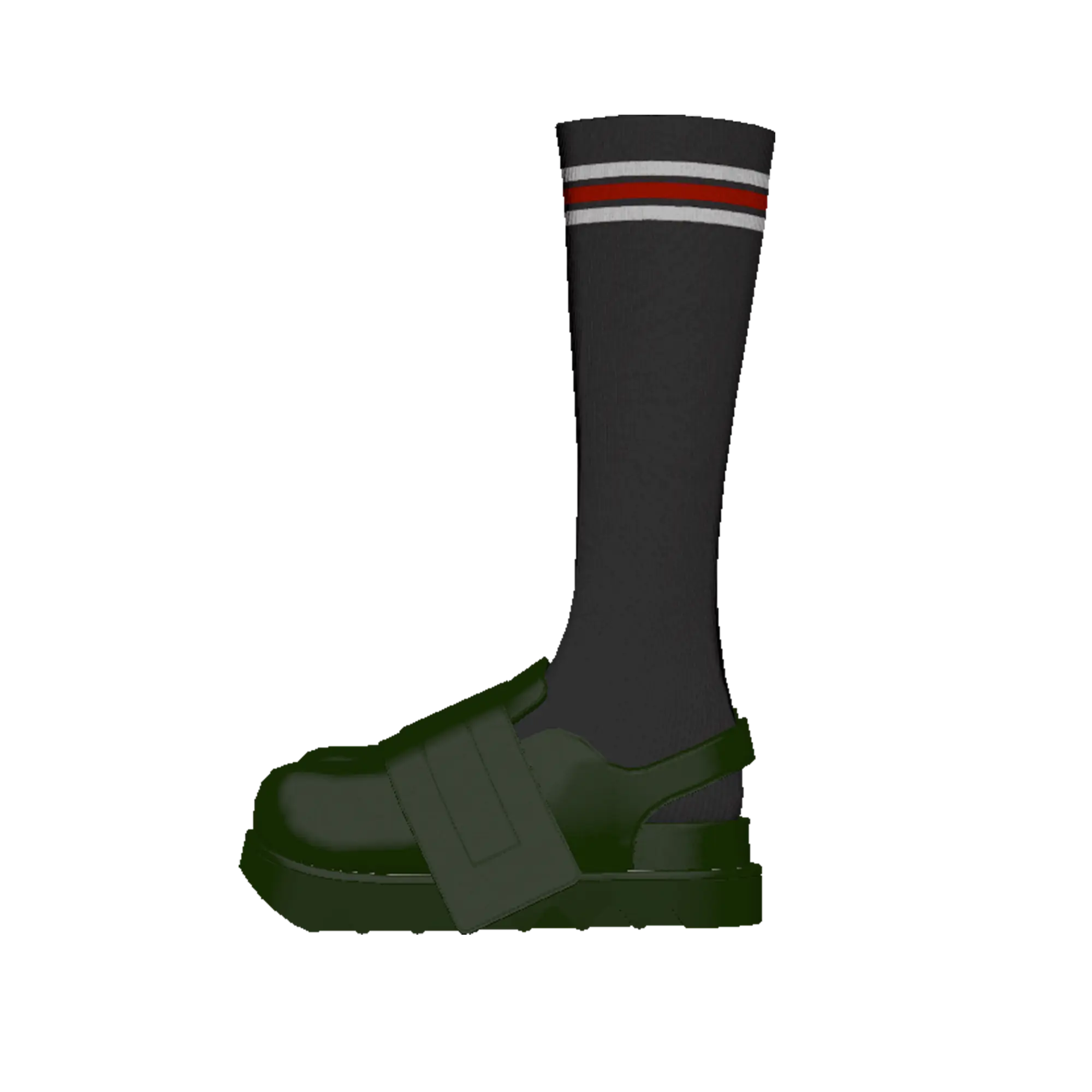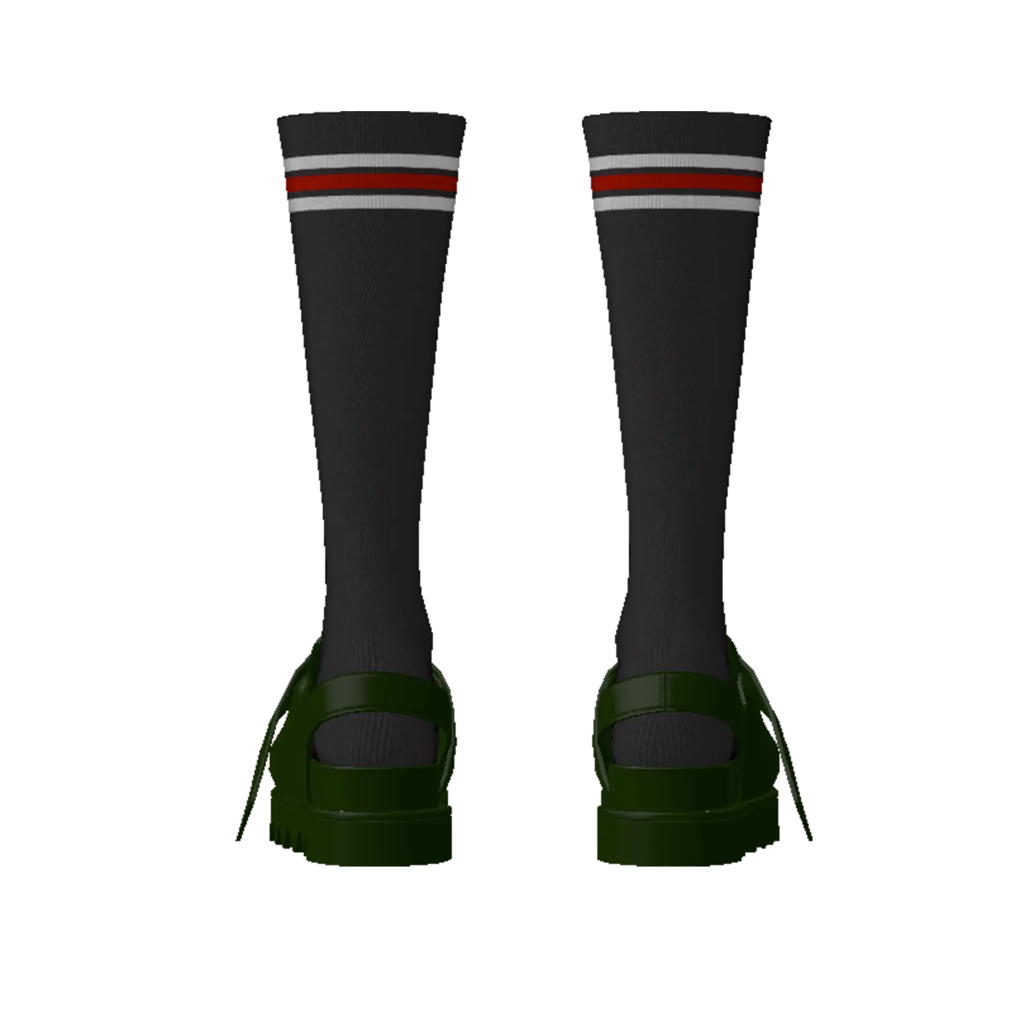 アッパーにレザーを使用し、ショートパンツと同じデザインを採用したベルテッドサンダル。ライン入りハイソックス付き。